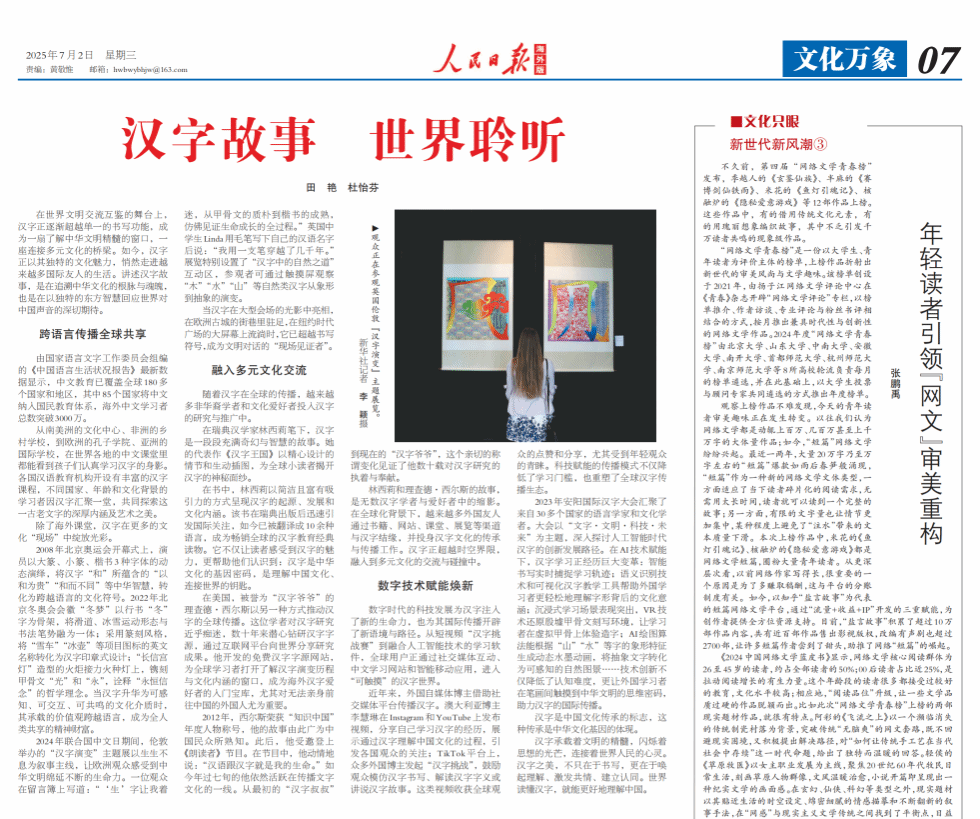 文章立足当下国际中文教育的广阔实践,以汉字跨语言视角下的现场对话为切入点,彰显了中华文明在全球文明交流互鉴中的独特价值与当代影响。文章还以国外汉学家和文化爱好者的故事为例,展现了汉字融入多元文化交流的生动图景,呈现了多元主体间的汉字表达,这些故事生动诠释了汉字文化的跨越性魅力。最后,文章通过数字技术实践,揭示了虚拟空间中的汉字焕新,呈现了汉字在全球传播中的创新路径与时代风貌。