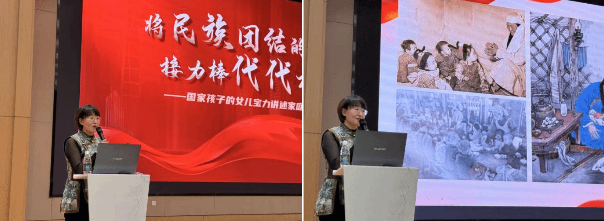 江傲霜副院长在开场致辞中指出,六十多年前草原母亲抚养南方孤儿的历史,是诠释民族团结的生动教材。她希望同学们从中汲取精神力量,未来能向世界精彩讲述中国民族大团结的故事。
