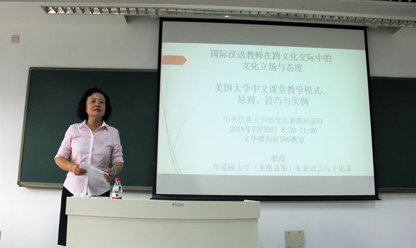 7月31日,梁霞教授为大家介绍了美国汉语教材的发展和使用现状,也对今后教材编写提出了建议。之后,梁霞教授又传授了语音和汉字教学的方法和策略,如强调纠音的重要性,可以用手势或重复的方式进行纠音。之后,梁霞教授以“到了北京”一课为例作亲身示范,每一次提问都可以看出老师备课的用心,为大家展现了成功汉语课堂教学应该有的模样。