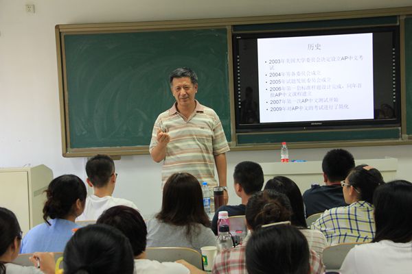 做了题为《美国AP中文考试的特点与对未来中文教学的影响》的讲座。国教学院2015级全体硕士研究生聆听了讲座,国教学院院长刘玉屏教授也出席了本次讲座。