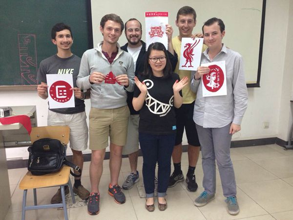 美国学生与剪纸老师汉语国际教育专业硕士廖婕合影