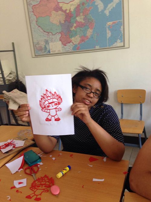 美国学生展示剪纸——奥运福娃