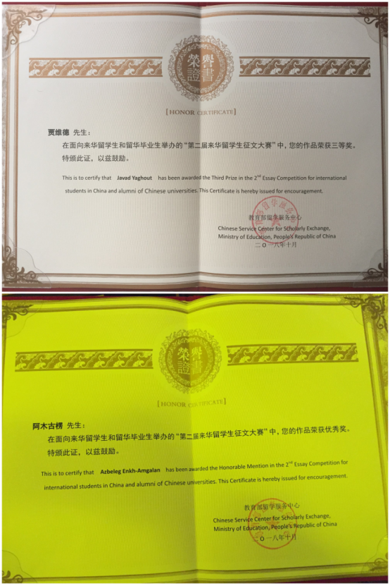 贾维德同学在《没有不历经艰辛就得到的宝藏》中表达了自己对中国古代的历史、文化和现代40年以来发展的认识与思考,描述了伊朗人今日对中国的了解和印象。贾维德写道:“中国人今天取得的成功是因为几千年的努力,这份意志和努力值得我们所有的人学习。”阿木古楞同学在《梦想与中国同行》中讲述了自己在中国上中学的经历,表达了自己成为中蒙两国之间交流大使的强烈愿望。阿木古楞写道:“早在中学时我就立志成为一名大使,而我的梦想正是从我十三岁来到中国后开始生根发芽并不断茁壮成长。”两位同学的征文意义深远,用雄辩的汉语讲述了自己对中国发展的自身感受以及对中国的佩服和赞叹。