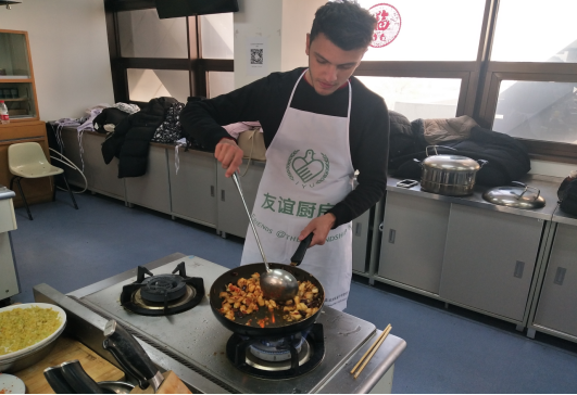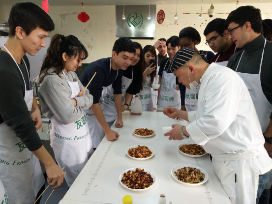 随后,烹饪老师开始教授同学们闻名中外的特色美食——“宫保鸡丁”的制作。“宫保鸡丁”可谓是外国学生最喜爱的中国传统美食之一,是外国学生进入中国菜馆必点的菜肴,所以同学们对这道菜的制作也表达了强烈的兴趣。烹饪老师首先耐心地为同学们讲解“宫保鸡丁”的制作过程,包括食材的搭配和制作的顺序等,随后同学们便自己开始制作。此次“宫保鸡丁”的制作是以比赛的形式进行的,同学们以组为单位,共进行20分钟,最后由烹饪教师评选出一二三等级。随着老师的一声令下,比赛正式开始,6个小组的同学迅速进入到“备战”状态,大家有的在切菜,有的在腌制鸡丁,有的在调味,场面好不热闹。20分钟过后,每个小组把自己做好的“宫保鸡丁”拿到桌子上,由烹饪教师品尝并评奖,最后来自塔吉克斯坦的艾力、刘莎莎和乌兹别克斯坦的沐为组成的小组获得一等奖。