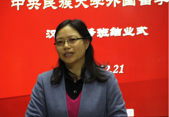 接着教师代表曾立英老师发言,她赞赏外国留学生一学期或一年来在汉语学习上的付出,并为他们取得的成绩和成长感到骄傲,并希望外国留学生回国后继续传播中国的文化。