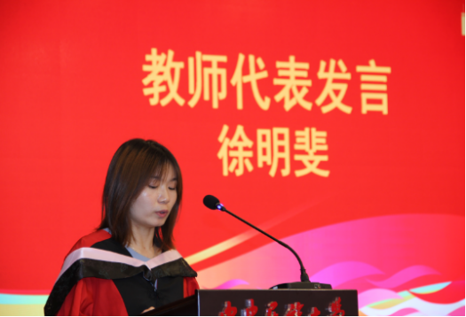 教师代表徐明斐老师表达了对毕业生的鼓励和祝福,她回顾在英国的求学经历时,深切地勉励同学们树立终身学习的意识与能力。同时,以其个人在学术道路上的不懈追求为标杆,鼓励大家不论在何时都应该保持不断学习的动力,在人生的道路上迈出坚实的每一步。