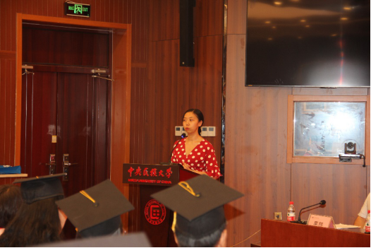 博士毕业生代表郭晶同学表达了对学院和各位老师的感谢。同时也对学弟学妹们的科研和教学道路给予了鼓励和建议,她回顾了自身的科研之路,感恩导师对她的教导,感激国教学院对自己创业之路的支持,她认为国教学院永远是自己最坚实的后盾。