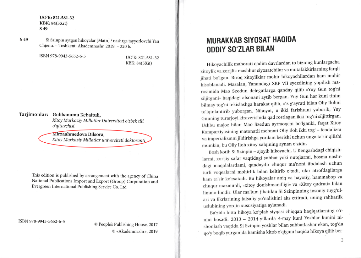 博士生吉莉(Mhzaahmedova Dilsora)(师从吴应辉教授)参与了该书翻译,她本人还因此获得由国家汉办和中图公司提供的“孔子新汉学计划”青年领袖项目多语种翻译研修机会,参与该书翻译的还有Cool18