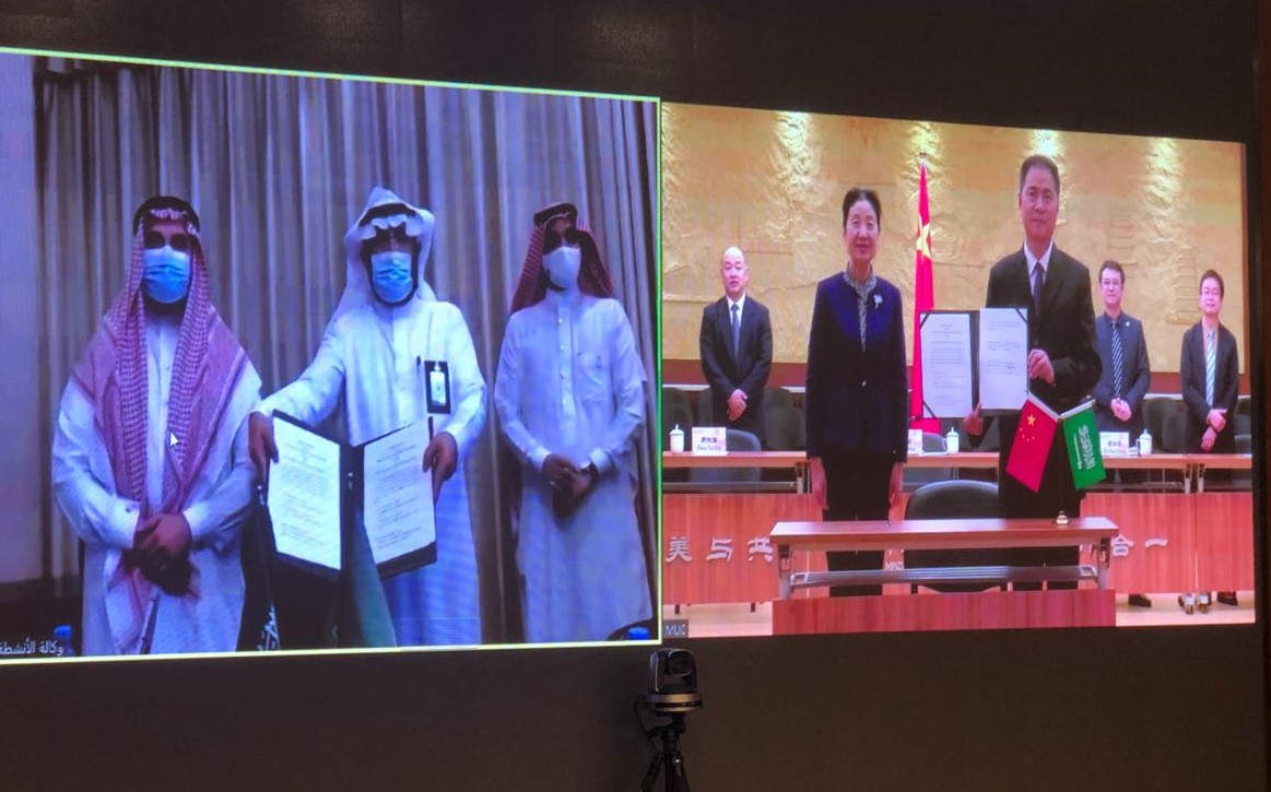 与沙特阿卜杜勒·阿齐兹国王大学中国文化交流中心视频签署合作协议仪式。学校党委常委、副校长宋敏,国际合作处处长胡华征,副处长袁剑和Cool18