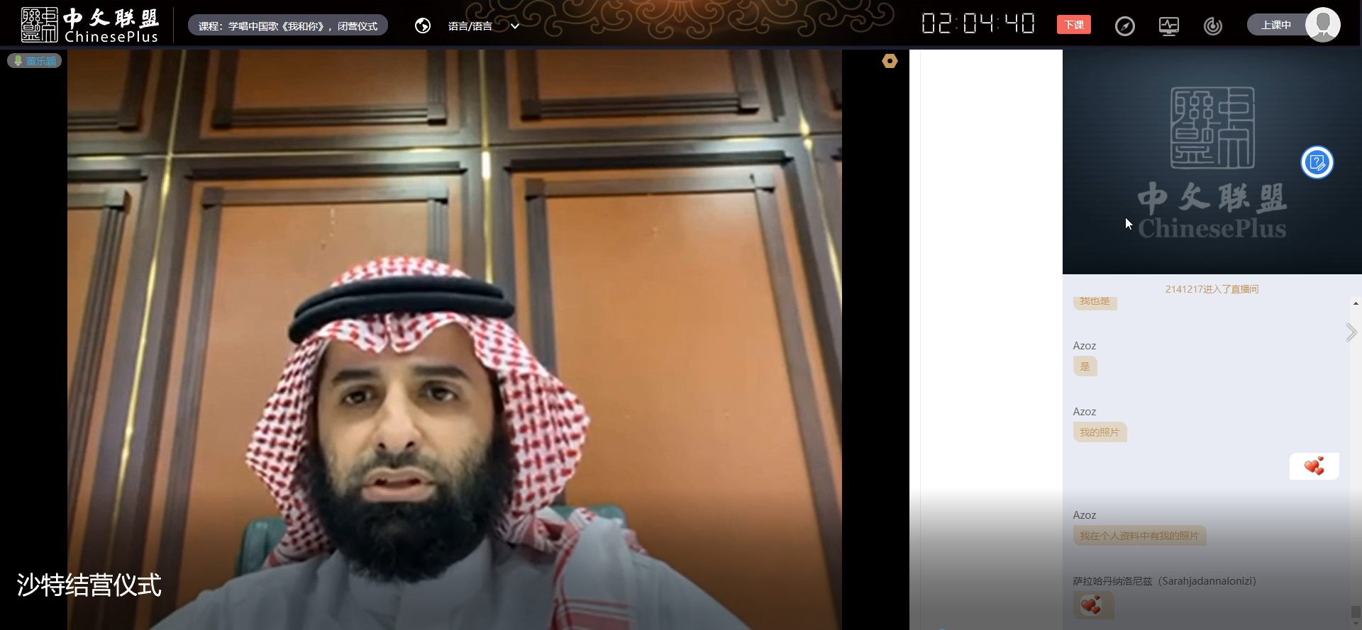 沙特学生也积极发言表达自己的学习感受。Madi同学说:“我喜欢学习,我会想念你们,我的老师。我也会想念我们的中文课。”Rusia同学说:“我很高兴认识你们。除了交流,我还了解了中国的发展。我喜欢这个课程的所有内容。我非常喜欢学习汉语,我以前觉得学习汉语很难,但是现在我觉得不难。谢谢你们!”