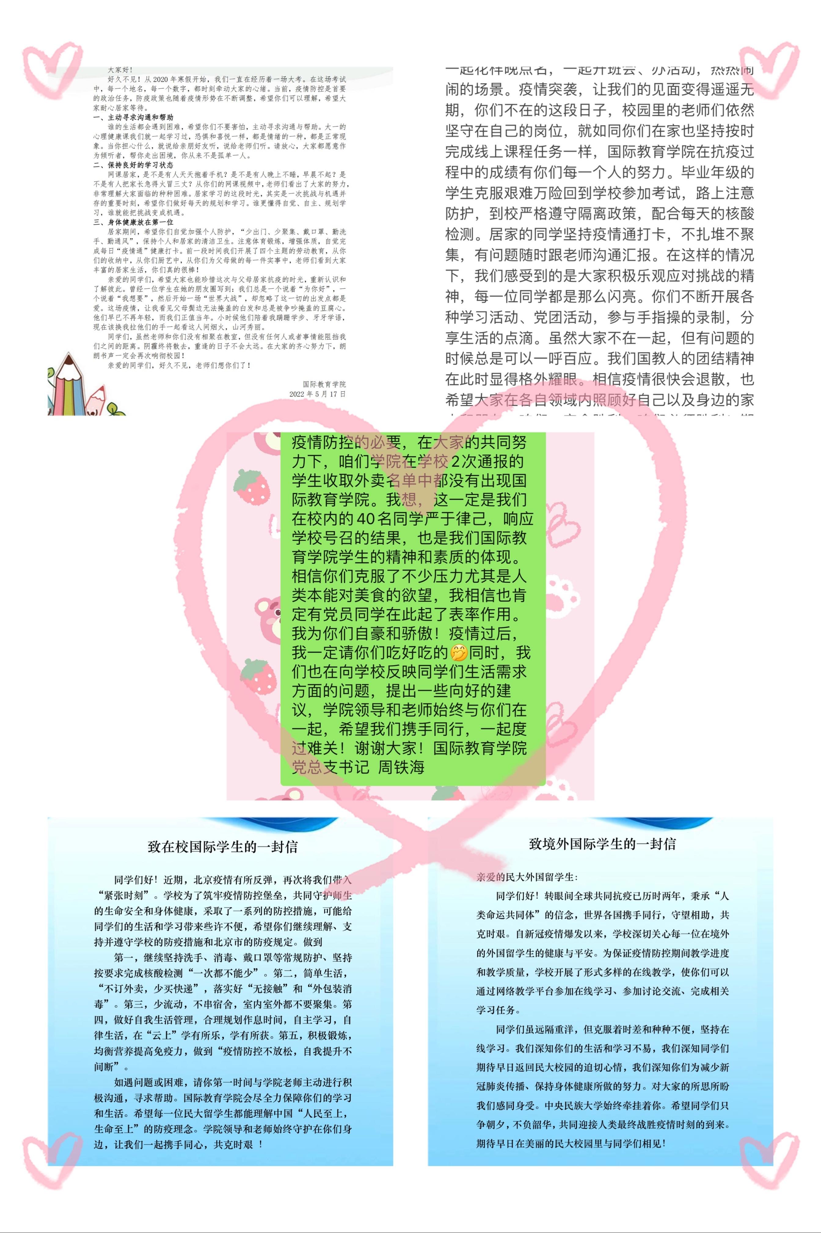 硕士们的信》、《致在校留学生的一封信》和《致境外民大留学生的一封信》。每封信里都饱含着学院老师对同学们无微不至的关心关怀和殷切的希望。学生们对此反响热烈,纷纷留言表示感受到了学院领导和老师对学生浓浓的爱。21级硕士生尹佩玲在留言中表示:“虽然疫情严重,但是身在国教院让人心里感觉暖暖的。谢谢老师们对我们各方面的关照。希望疫情能够早日过去,也祝愿我们能够过上不戴口罩的日子,在生活和工作中闪闪发光。”本学期Cool18
