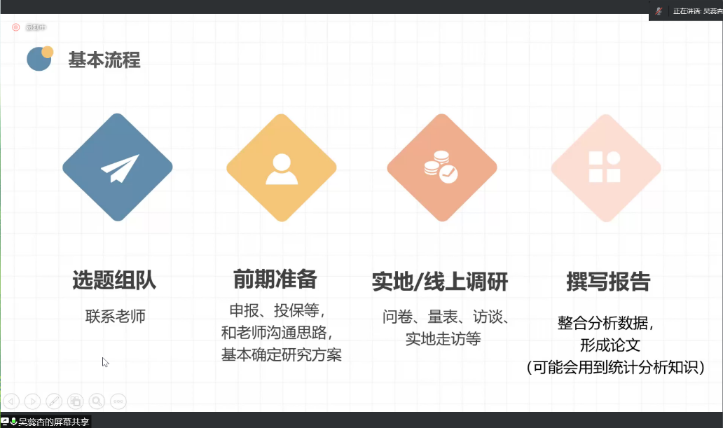 具有丰富调研经验的吴蕊杏同学从自身实践出发,和同学们分享了自己的经验。她提出,在社会实践过程中要充分发挥领队的作用,加强团结协作,注意各环节的截止时间,做好各材料的保存和归档,加强和指导老师之间的沟通和联系。