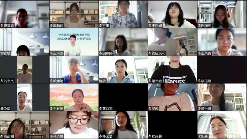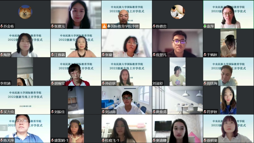 线上开学仪式如期而至。出席本次会议的有:学院党总支书记周铁海,副院长江傲霜,副院长、党总支副书记李锷,副院长陈天序,学院办公室主任刘国庆,党团与学生工作办公室主任买力克,教学办公室主任孙宓琪,中国本科生教研室主任徐明斐,国际本科生教研室主任、2022级国际本科生班主任扎西央青,研究生教研室主任谷陵,中国本科生辅导员李雅洁,国际本科生辅导员王丙龙,团委书记、研究生辅导员刀慧娟,2022级中国本科生班主任袁萍、胡琬莹,以及2022级全体本硕博新生。