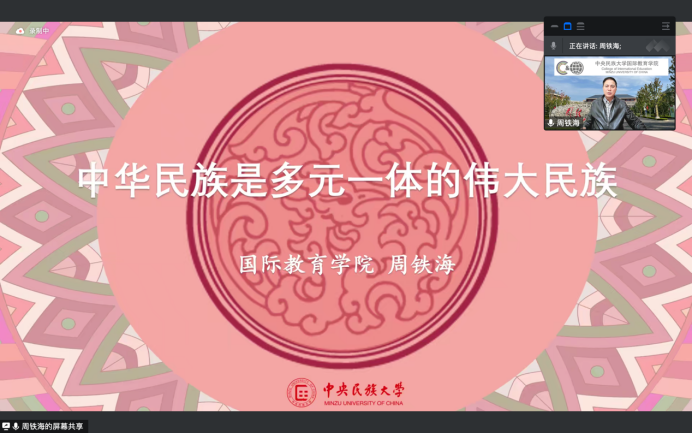 周铁海书记以“中华民族是多元一体的伟大民族”为主题,分别从中华民族概念的提出与认识,中华民族多元一体格局和中华民族是一个命运共同体以及努力成为国际化人才、助力构建人类命运共同体几个方面进行了讲解。