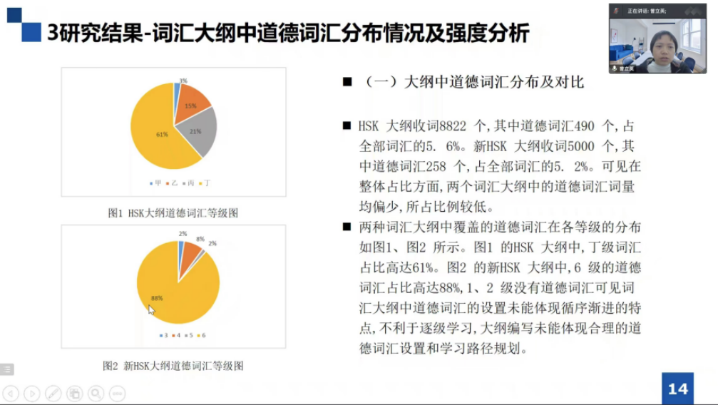 随后,曾立英教授就其最新发表的《国际中文词汇大纲和教材中的道德词汇研究》一文,深入展开论述,对汉语教材(北大版《汉语教程》)中道德词汇的分布及对比、出现强度及与词汇大纲的匹配考量依次做了详细说明。 曾老师的研究是基于数据库进行的统计分析和评估,为Cool18