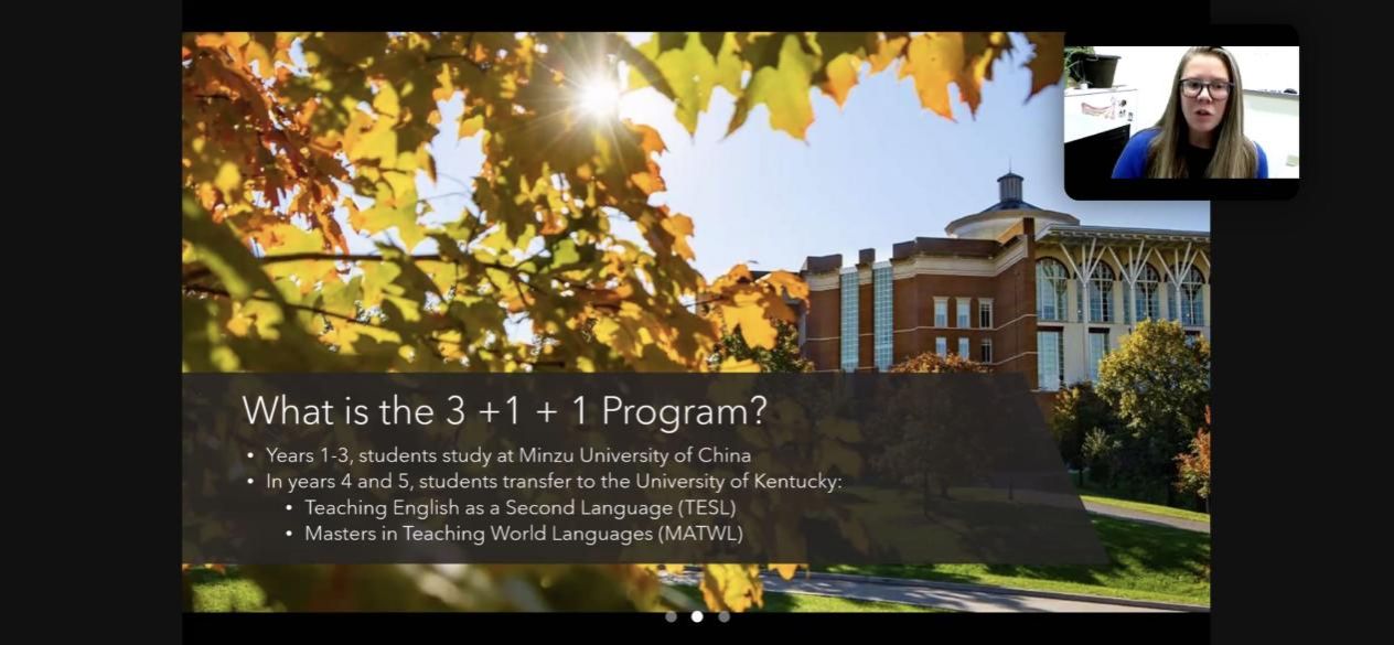 合作的“3+1+1”本硕连读项目进行了线上宣讲。本次宣讲会特邀美国肯塔基大学国际本科生项目负责人Megan Koshurba和二语教学项目(TESL)现任负责人柯思慧老师主讲,Cool18