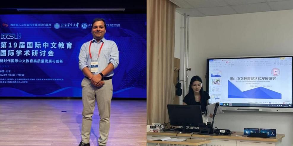 在区域国别研究分会场,2021级博士生张德江(CHANDAN SINGH)、2020级博士生雷歌分别报告了题为《印度高校本土中文师资队伍现状与建设策略》和《黑山中文教育现状与发展研究》的研究。
