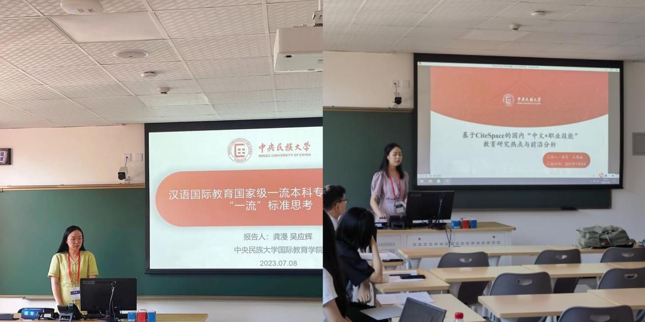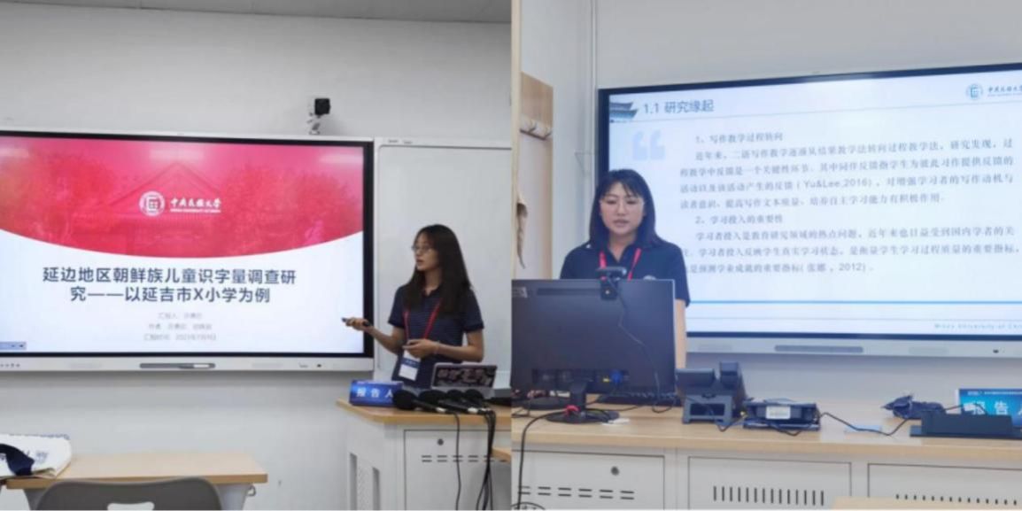 在国际中文教学研究分会场,2021级博士生武晓琴、2022级硕土生许惠珍与胡姝辰进行了题为《汉语二语写作同伴反馈投入研究》和《延边地区朝鲜族儿童识字量调查研究——以延吉市X小学为例》的报告。