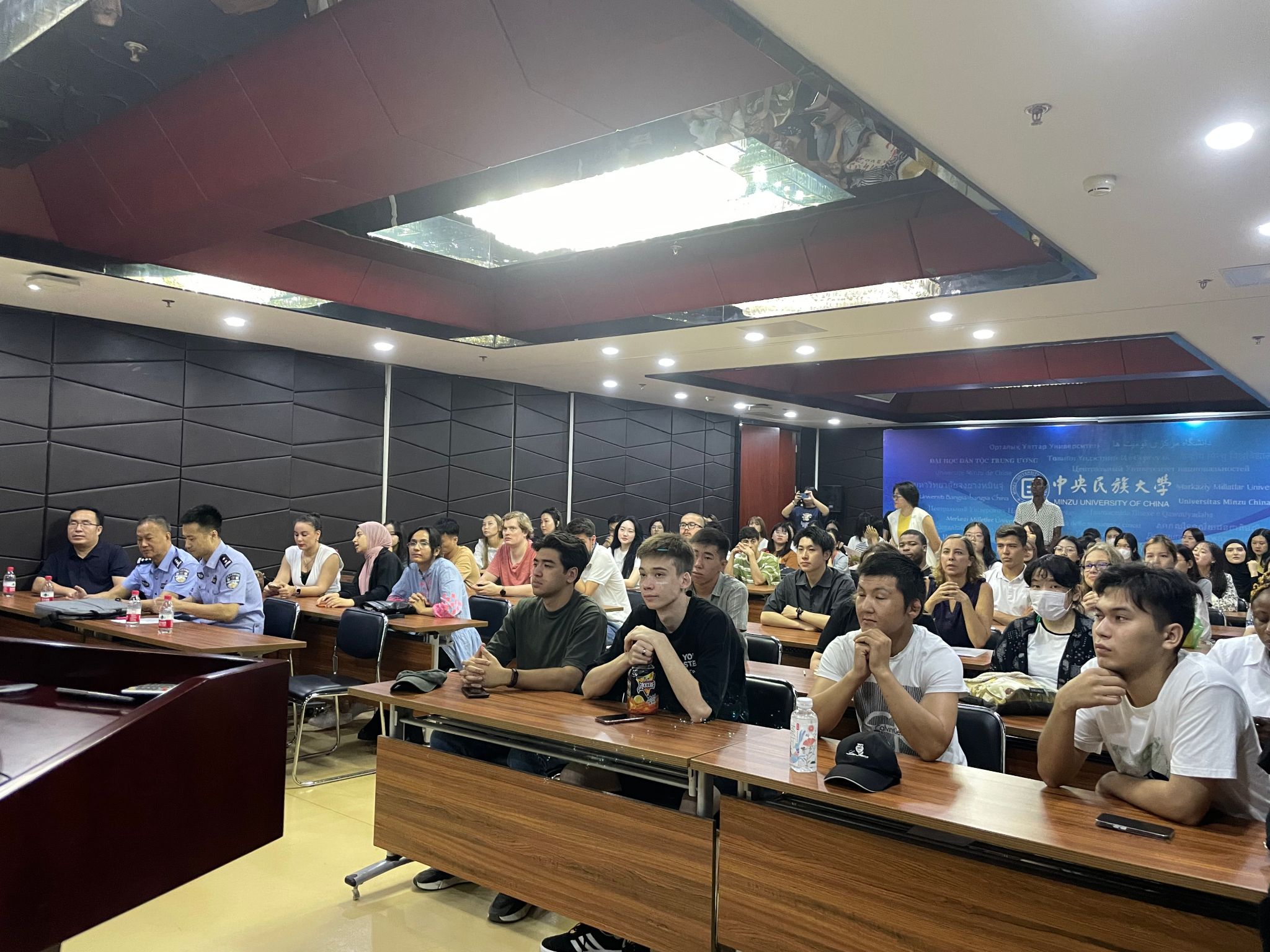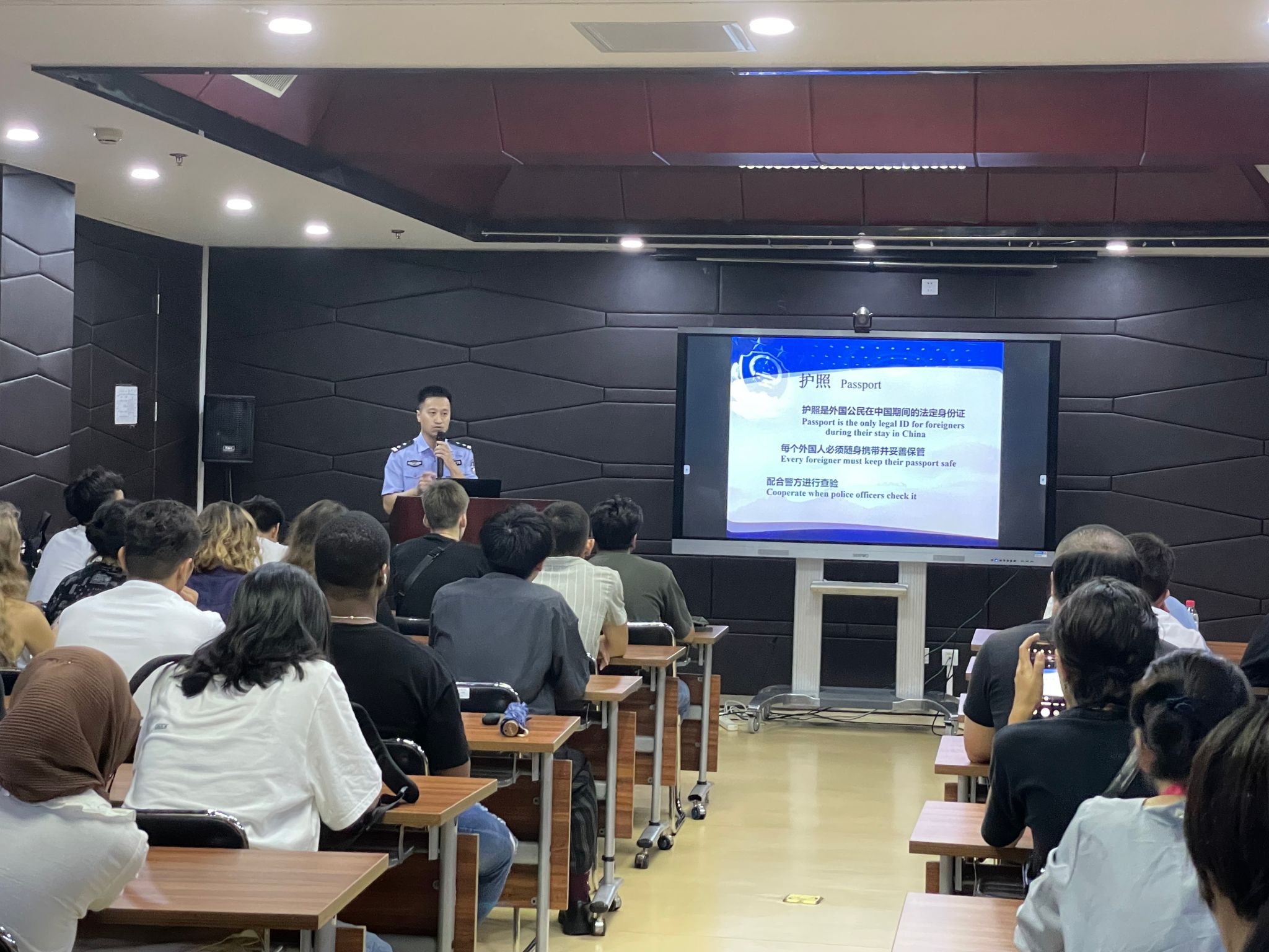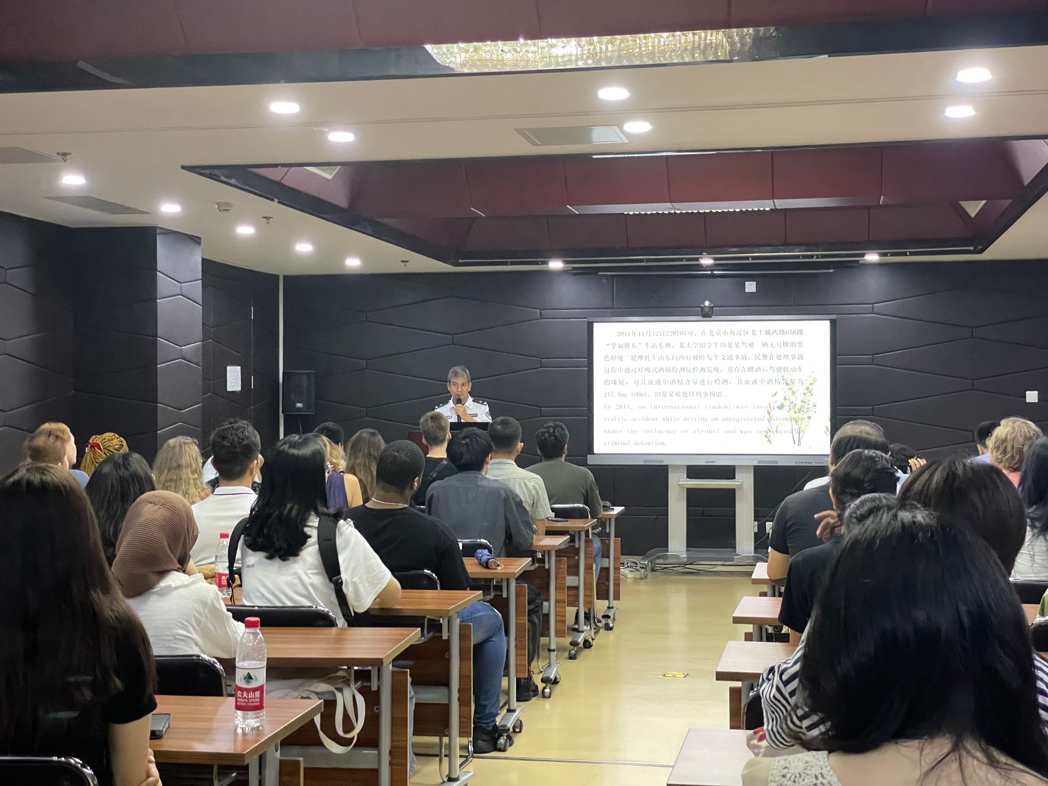 党委副书记、副院长李锷,学校保卫部副处长苗运长,学生事务办公室相关负责老师和95名国际学生新生参加了会议,会议邀请了北京市海淀区高等院校交通安全工作部门联席会办公室和北京市公安局海淀分局出入境管理大队警官做了专题宣讲。