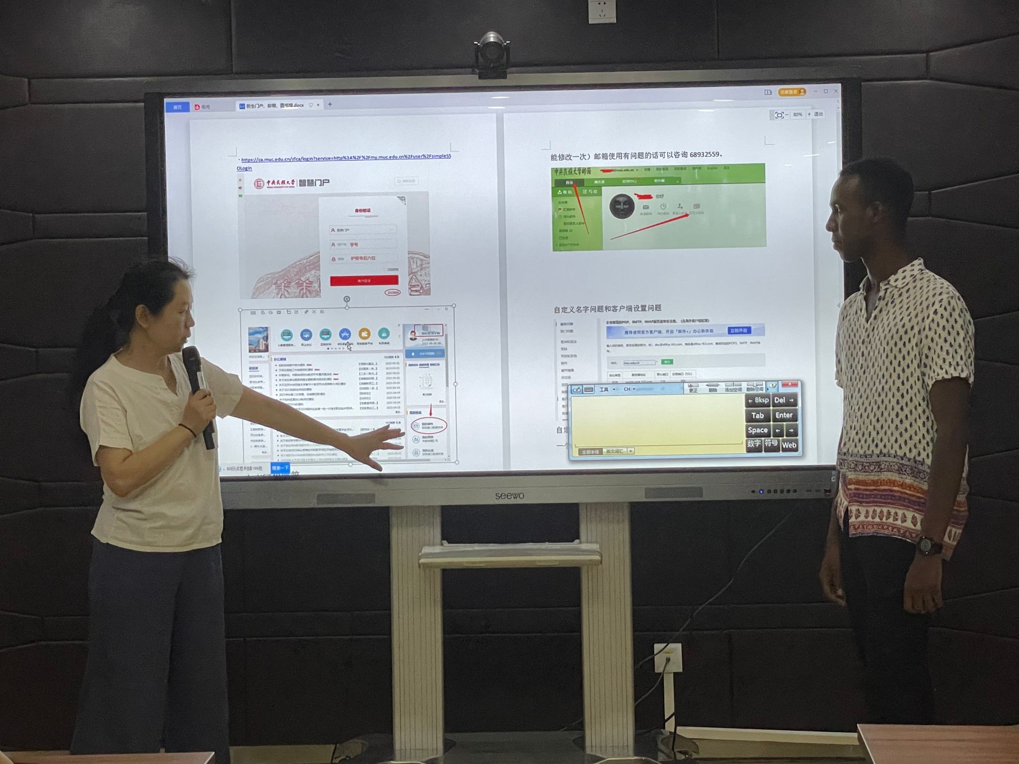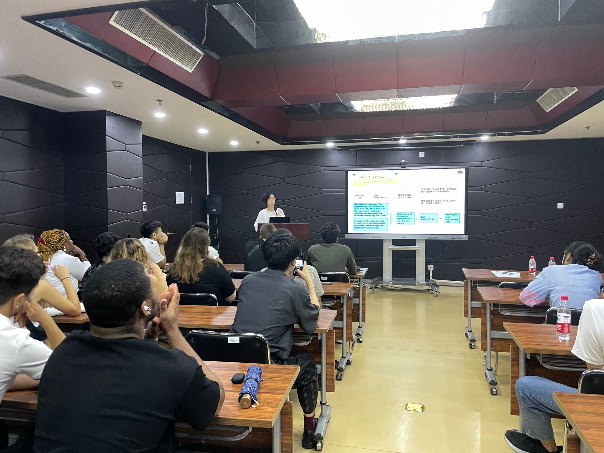 学院学生事务办公室的张芸老师详细介绍了来华留学综合医疗保险使用说明,对住宿安全须知进行了提醒。王丙龙老师指导同学们下载企业微信,指导如何登录使用。陈力老师向学历生介绍了校园智慧门户的使用方法。