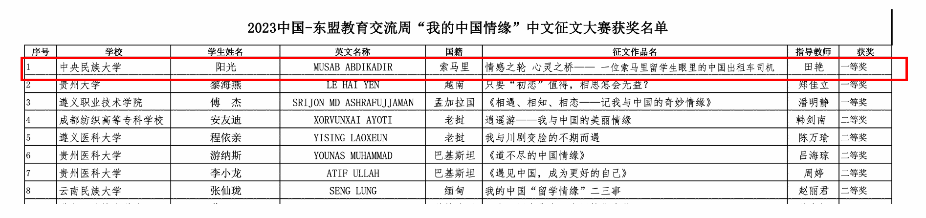 国际学生阳光(MUSAB ABDIKADIR)脱颖而出,荣获本次征文大赛一等奖第一名,田艳副教授荣获优秀指导教师奖。