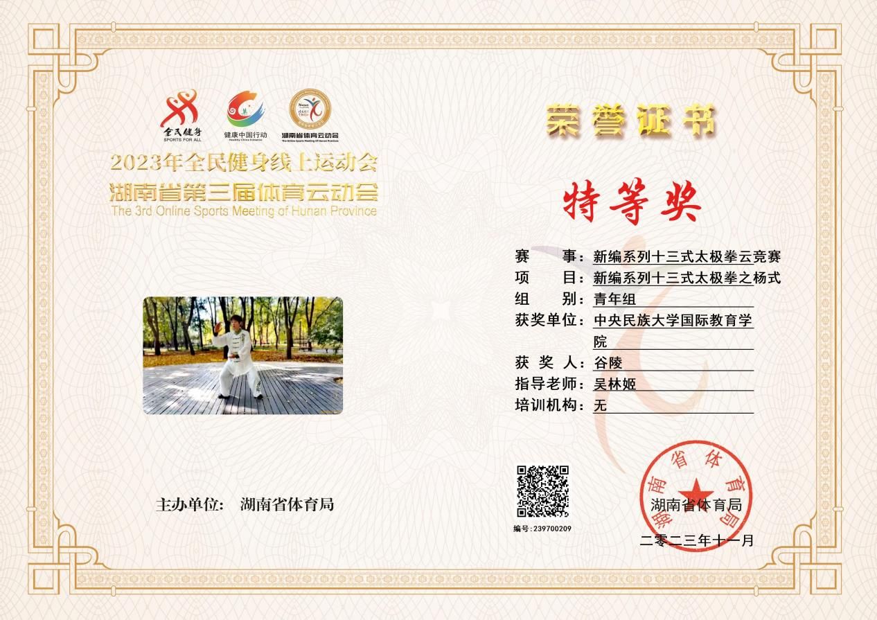 此次比赛由国家体育总局群体司、中华全国体育总会群体部和湖南省体育局联合主办,以视频作品方式参赛,在李锷副院长的鼓励和支持下,语言进修与项目部精心组织,在太极拳课的基础上,学院组建了一支太极拳队伍,由任课教师谷陵带队,报名参加了四个个人项目和一个集体项目,其中个人项目中缅甸留学生赵帅荣获青年组一等奖,教师谷陵荣获青年组特等奖和最佳人气奖,获评最佳教练奖。
