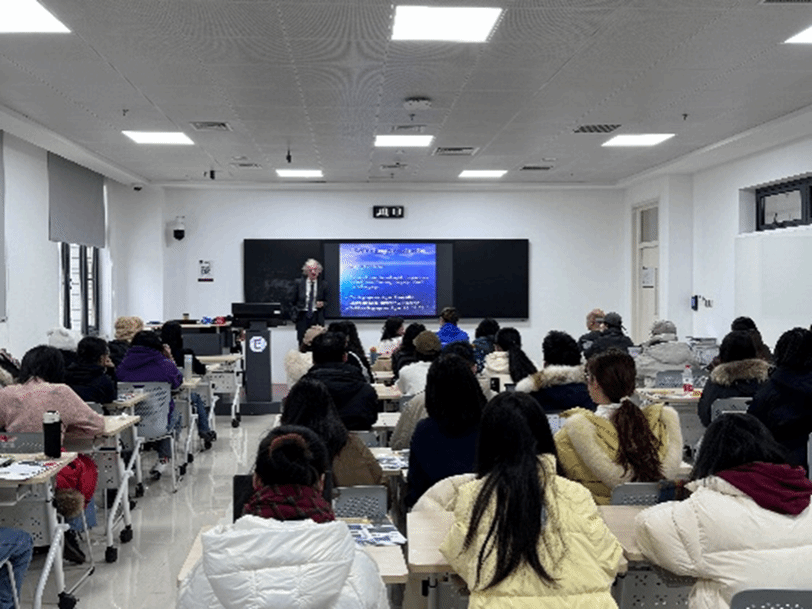 党委副书记兼副院长李锷主持,科克大学驻北京办事处负责人张蓓、学院教学办公室主任孙宓琪及2023级汉语国际教育专业硕士研究生参加了讲座。