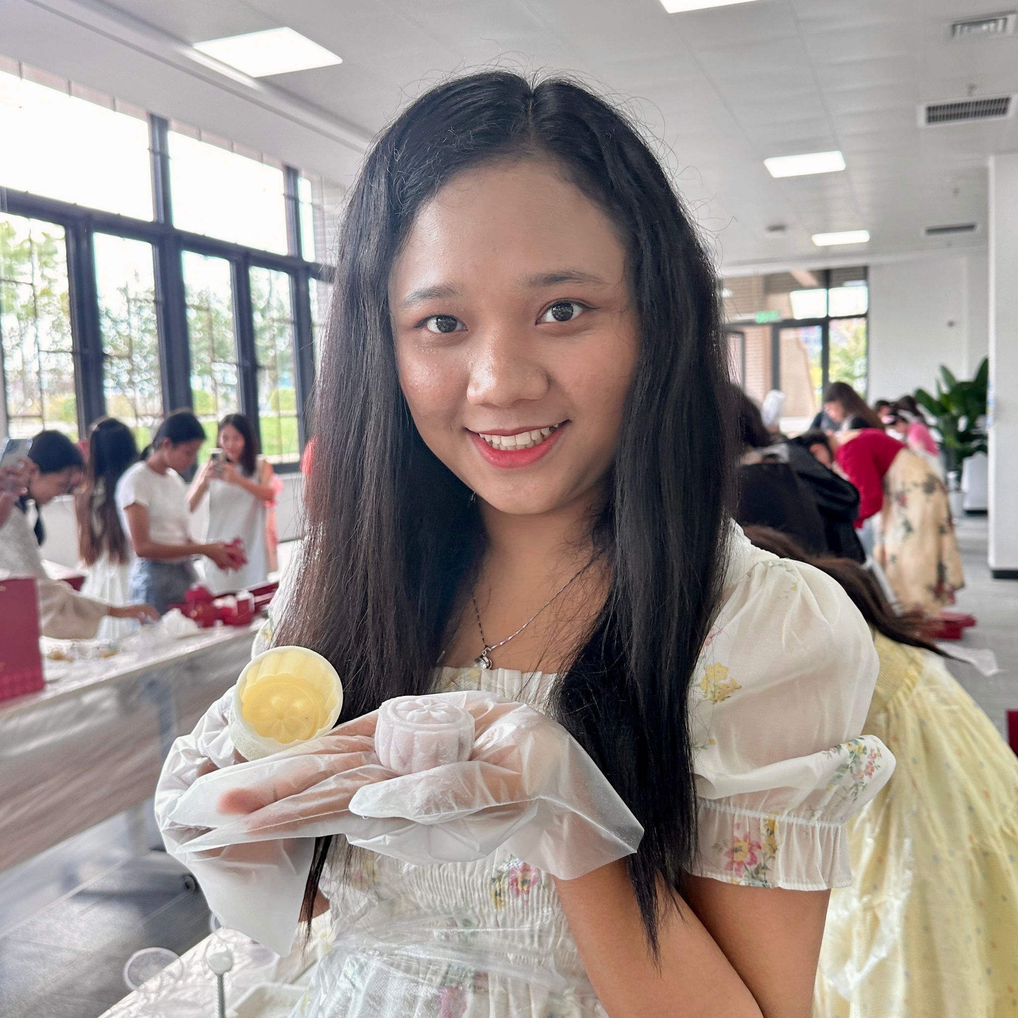 来自缅甸的刘好真高兴地展示着自己的“月饼作品”。“这是我第一次亲手尝试制作月饼。虽然我做的月饼成型不是很完美,但最终看到自己制作的成品,我感到无比的满足和自豪。”“这次中秋节活动让我第一次亲身体验到了做月饼的乐趣。我知道中秋节不仅仅是一个团圆的节日,更是一个承载着中华民族文化和情感的节日。在这个特殊的日子里,无论是亲人团聚,还是朋友相聚,都充满了温馨与感动。这次学校组织的中秋节活动让我收获颇丰。通过亲身参与和体验,我不仅提高了自己的动手能力,也对传统文化有了更深的理解和感悟。更重要的是,这份经历让我更加珍惜与朋友在一起的每一个时刻,更加懂得感恩和分享。”