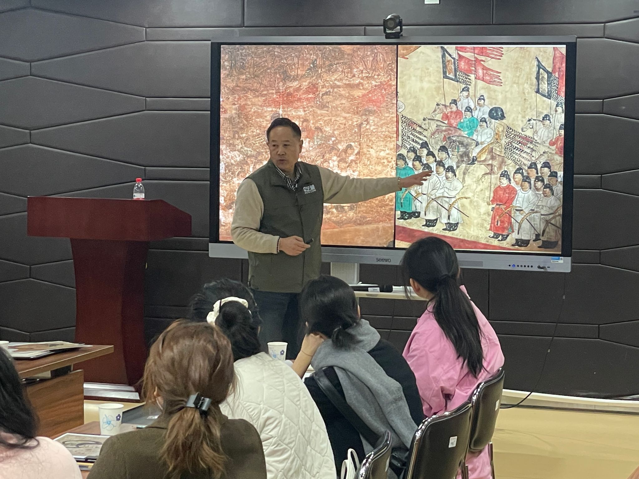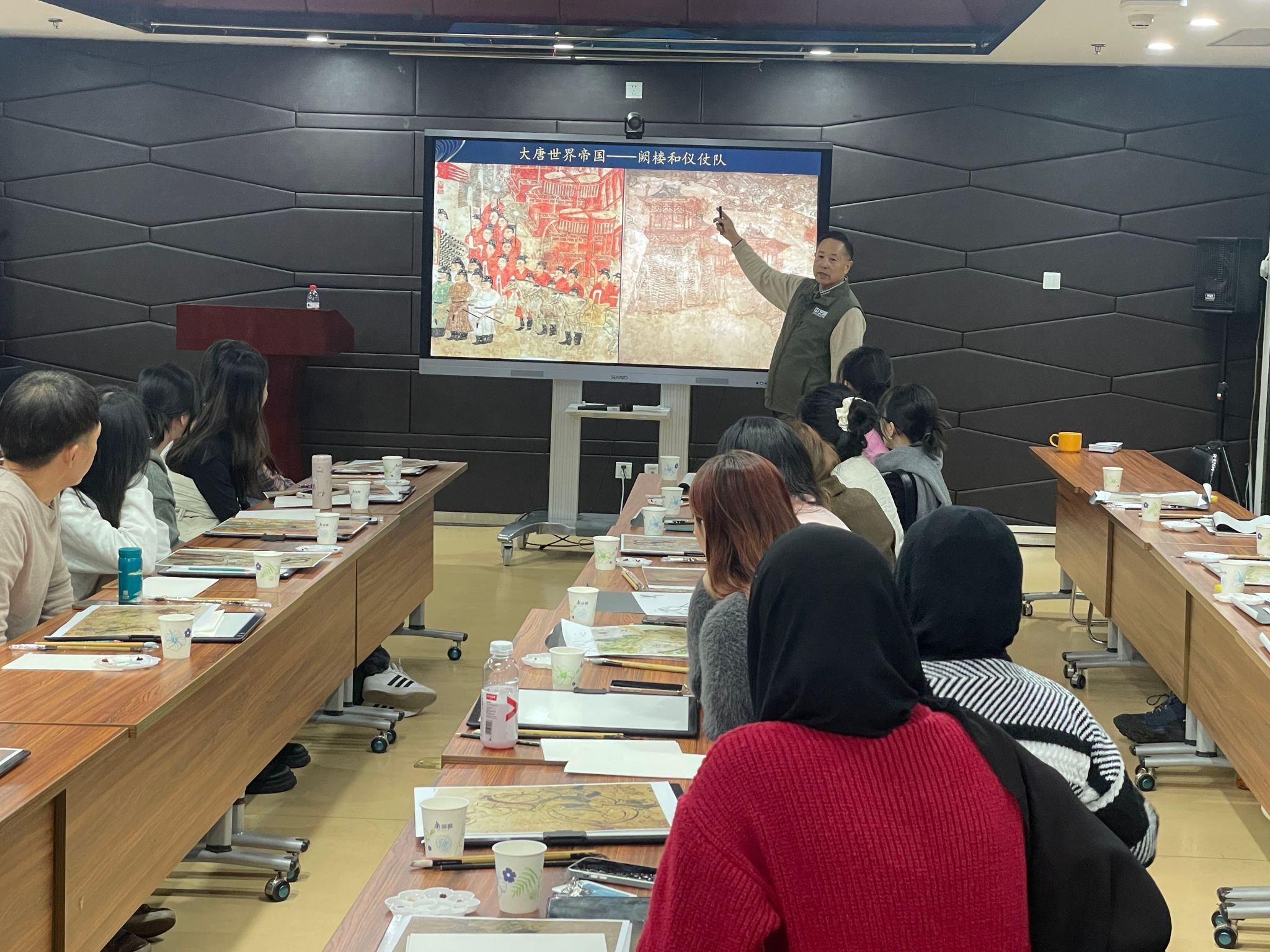 报告厅参加了此次活动。活动特邀陕西历史博物馆壁画专家王建岐老师和西安碑林博物馆壁画专家刘莲芳老师及其团队,为同学们带来一堂既生动又有趣的文化体验课。
