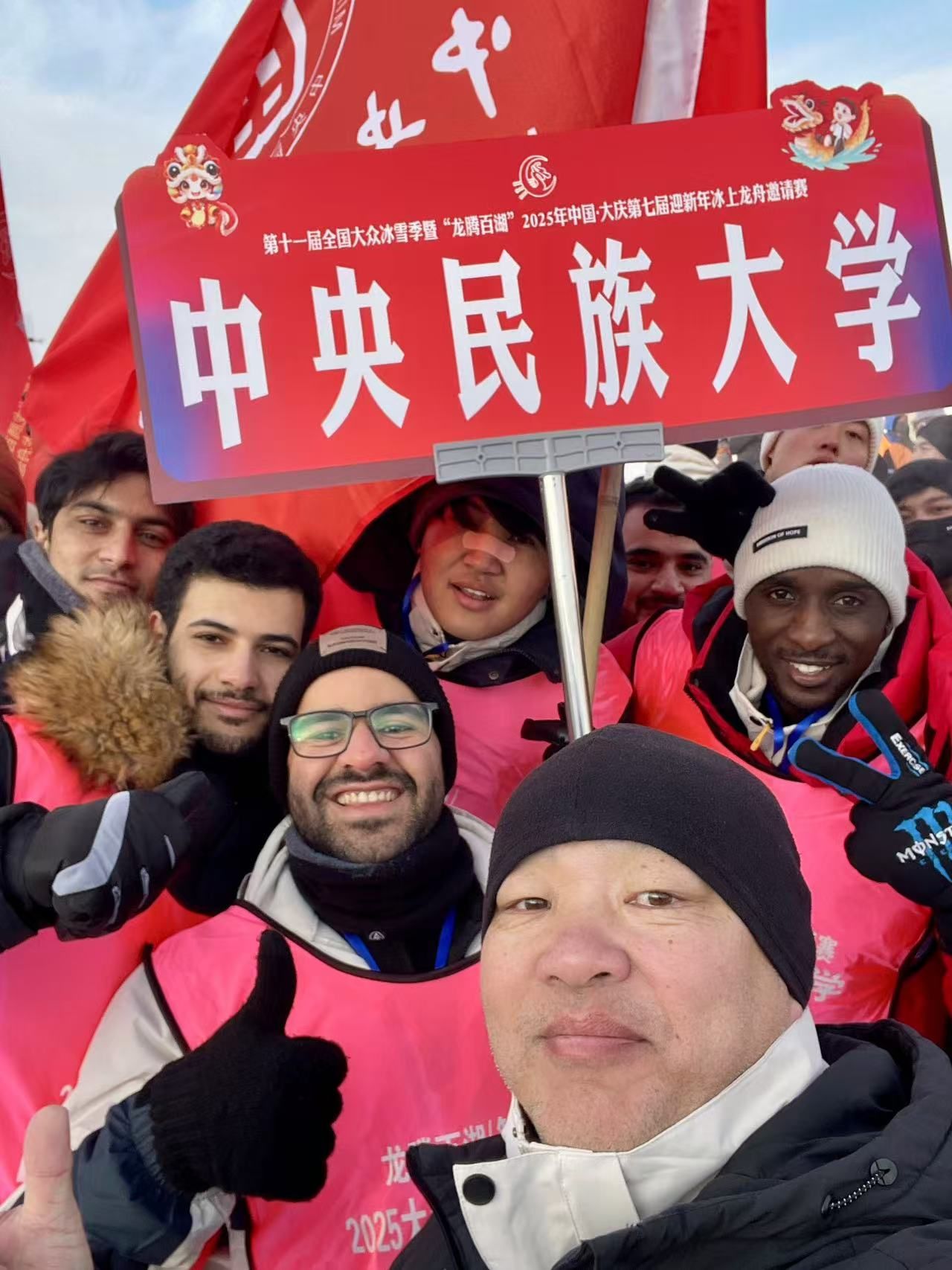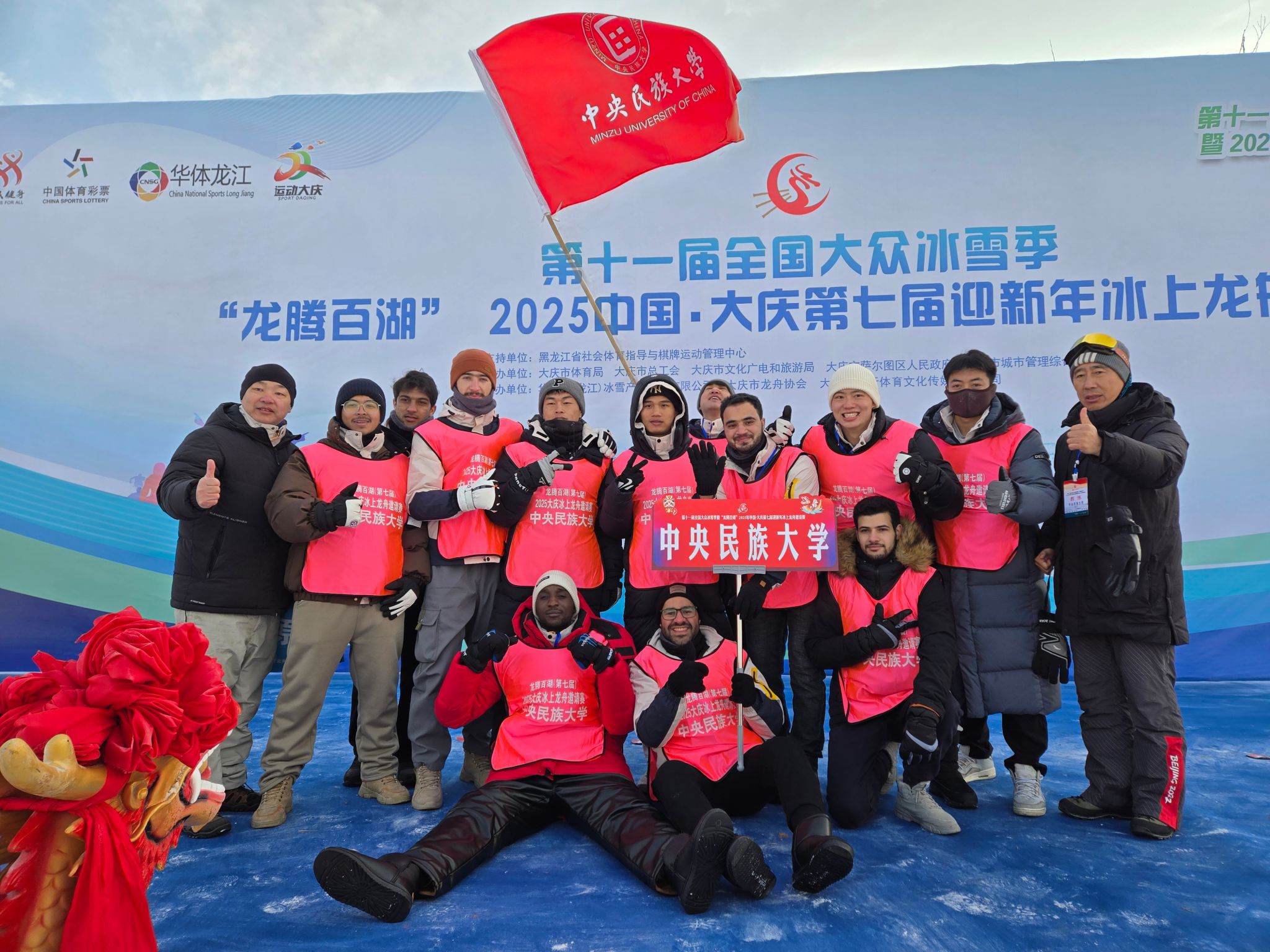 国际冰上龙舟队应邀参加了第十一届全国大众冰雪季“龙腾百湖”2025中国·大庆第七届迎新年冰上龙舟邀请赛,队员们在比赛中充分展现了民大学子的青春风采,也促进了中外文化的交流与融合。