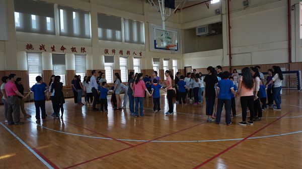 下午三点,趣味运动会的时间到了,党员们聚集到盲校体育馆,见到了盲校的孩子们。他们统一穿着蓝色的校服,系着红色的红领巾,叽叽喳喳的有说有笑。盲校老师按一名党员带一名孩子手拉手分好组。比赛还没开始,孩子们就热情开朗地围着跟自己一组的党员问个不停。第一个进行的游戏是“水果蹲”,每一个大组是6、7个人,再分成十个小组,每组围成一个圈,各自代表一种水果。被喊到的组要集体下蹲,没反应过来的和蹲错的就要被淘汰。比赛进行很激烈,有的组互相“抬杠”,不断互相喊对方下蹲,直到有的组坚持不住败下阵来,整个体育馆充斥着孩子们欢快的笑声。