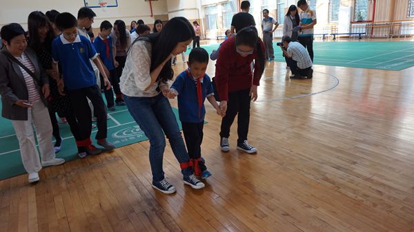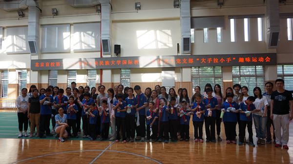 的三十名研究生党员来到了北京市盲人学校进行了参观,并和盲校的孩子们一起进行了一场别开生面的“大手拉小手”趣味运动会。