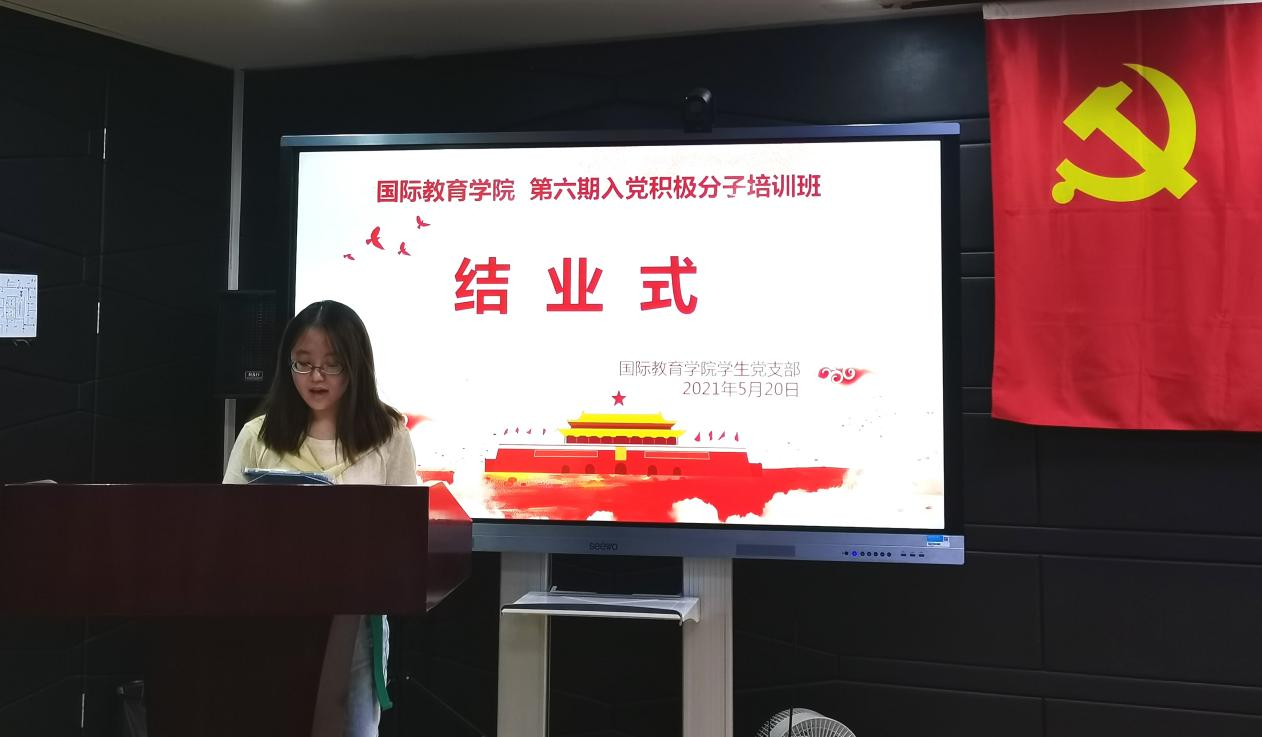 党员许惠珍同学针对18位学员的学习情况做了简单汇报。她指出:在培训期间,每位学员均积极、认真、高效地完成了线上学习任务,并在每一阶段都以小组的形式进行思想交流、汇报,能够做到在学习党的相关知识的过程中提高思想觉悟,坚定入党决心。