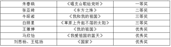 本次选手选取的歌曲都十分具有代表性,一等奖选手朱春晓以高昂的音调,饱满的热情演唱《唱支山歌给党听》,向我们传达了她心中对党组织、对祖国的炽热之情,让在场的听众不由得为之叹服。二等奖选手张亚琦为我们带来的《东方之珠》唱出了香港回归之际,国人的骄傲与自豪,整首歌曲在张亚琦的动情诠释下,让人不由得感同身受。