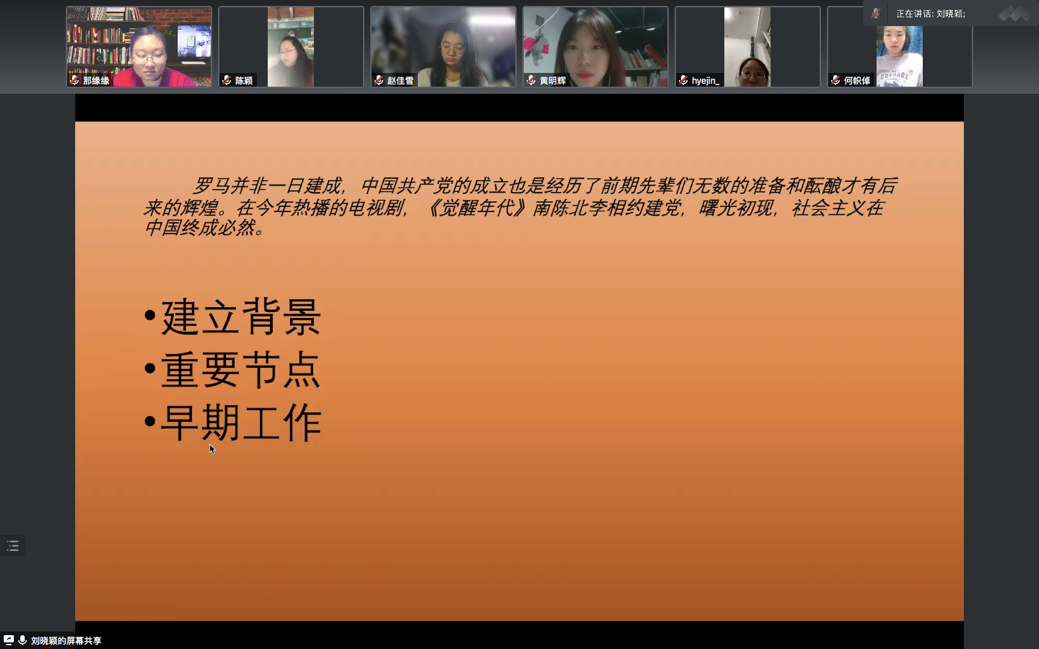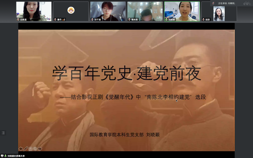 本科生党支部在线上开展了第四次“党员讲党课”系列学习活动。第四讲的主题为“学百年党史·建党前夜”。党课由支部书记白照星同志主持,由支部党员刘晓颖同志主讲,Cool18