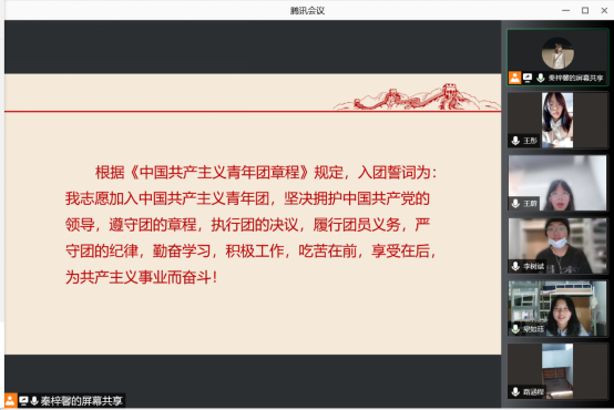 最后,支部进行了入团誓词的重温,即“我志愿加入中国共产主义青年团,坚决拥护中国共产党的领导,遵守团的章程,执行团的决议,履行团员义务,严守团的纪律,勤奋学习,积极工作,吃苦在前,享受在后,为共产主义事业而奋斗!”,各团员再次坚定了入团初心,纷纷表示愿在新的一年坚持学习新思想、争做新青年,不断完善与提升自己。