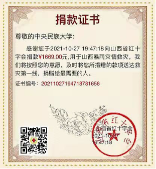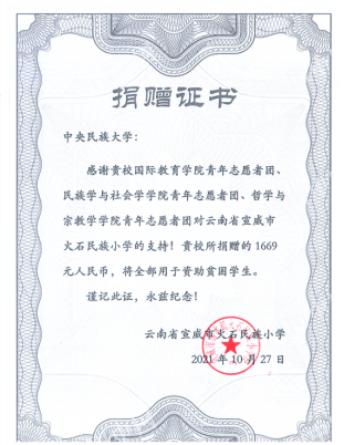 的名义捐给云南省宣威市火石民族小学和山西洪灾中的受灾群众,相关报道被推选至北京市团学公众号。
