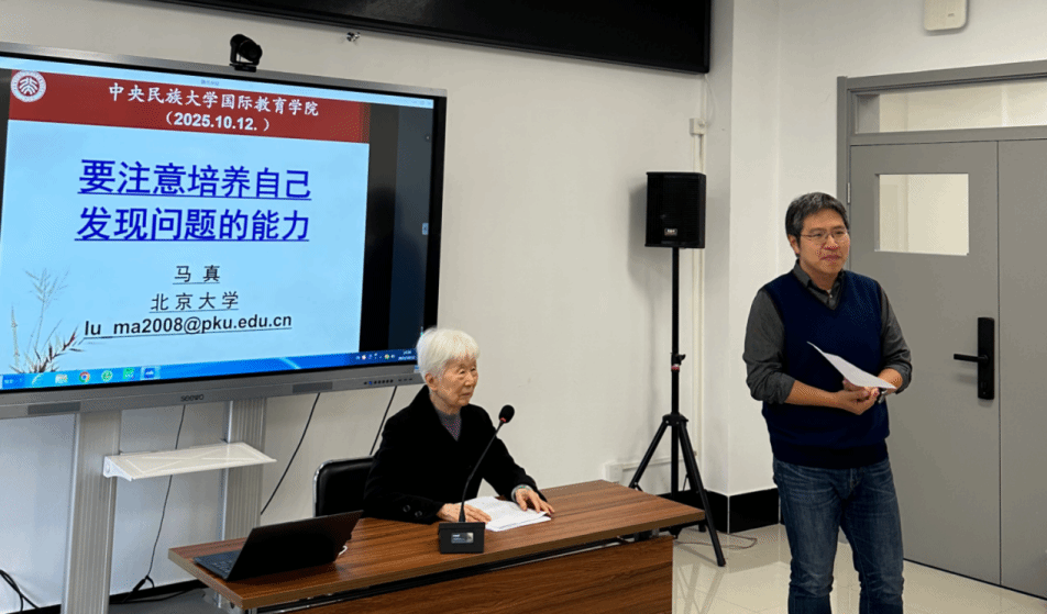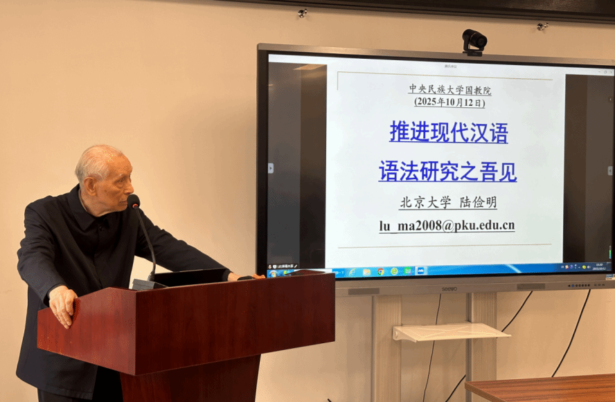 2025年10月12日,Cool18 在海淀校区举办学术讲座,邀请著名语言学家、北京大学陆俭明先生与马真先生,分别以《推进现代汉语语法研究之吾见》和《要注意培养自己发现问题的能力》为题,围绕现代汉语研究与学术能力培养分享核心观点。本次讲座是“本科生课程思政团队建设项目”“研究生精品示范课程培育项目”“中央民大‘交叉学科协同攻关项目’”和“国家民委‘高校教学改革创新项目’”系列讲座之一。讲座由Cool18 陈天序院长主持,文学院翟燕教授、Cool18 曾立英教授分别主持互动环节,Cool18 娄开阳教授与谈,现场师生互动积极,气氛活跃。