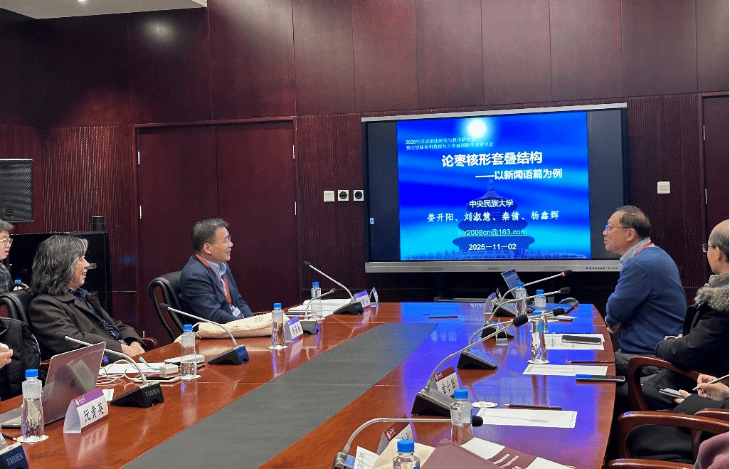 娄开阳教授作了题为《论枣核形套叠结构——以新闻语篇为例》的报告。他系统阐释了枣核形套叠结构的三大类型、构成方式及语义关系,并构建出20小类图式结构类型。报告引发了与会代表的热烈反响。
