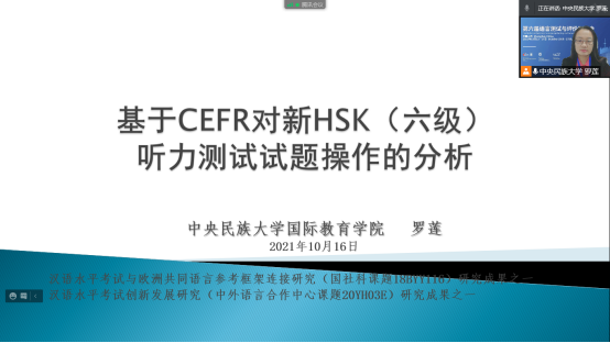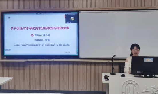罗莲老师主持了“语言标准及其应用”分组报告。她的报告题目为“基于CEFR对新HSK六级听力测试试题操作的分析”。该研究基于欧洲共同语言参考框架中的听读详表,对现有HSK(六级)听力试题的认知操作进行了分析,并提出了改进建议。在“教育评价改革与语言测评”分组报告中,硕士研究生陈梦雨做了题为“语言测试机构考试服务比较研究:以EST和语合中心为例”的报告。该研究基于企业营销服务理论,以ETS和语合中心为例,对语言测试机构的服务进行了比较研究。在“汉语测评”分组报告中,硕士研究生莫小珊做了题为“关于汉语水平考试需求分析模型构建的思考”的报告,提出汉语水平考试需求分析可以从基本信息、语言信息与专业信息、差距分析、对现有的汉语水平考试满意度、对汉语水平考试的期望、对考试资源的需求、政策分析七个维度采集和分析数据,以期为汉语水平考试的研发和改进提供需求分析的方向。报告体现了Cool18