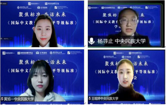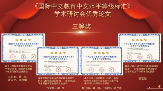 2021级硕士研究生魏少丽、黄旭、杨寻止、王暄婷作为一个团队在罗莲老师的指导下分别做了学术报告。她们的报告从内容分析的角度,分别依据HSK(五级)写作、阅读、听力和HSKK(中级)口语的数据,从多个维度对现有的HSK(五级)以及HSKK(中级)口语的试题任务和考生产出进行了分析,探讨与《等级标准》的对应情况,回答了HSK能否与《等级标准》对应以及预估对应等级的问题,并提出了相关建议。其中,该团队的论文“基于内容分析对HSK(五级)写作任务与《等级标准》的等级对应研究”向研讨会投稿并参加优秀论文评选,荣获了《国际中文教育中文水平等级标准》学术研讨会优秀论文三等奖,这一成绩对于一年级新生来说是很难得的。