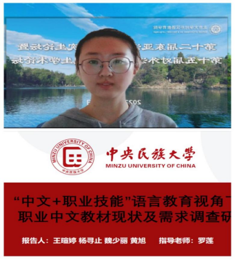 硕士研究生王暄婷团队以《“中文+职业技能”语言教育视角下的职业中文教材现状及需求调查研究》为题进行了学术报告。报告对当前缺少相关职业中文教材的行业或领域进行了需求分析并作出了预估,以期能为将来的职业中文教材建设提供参考。