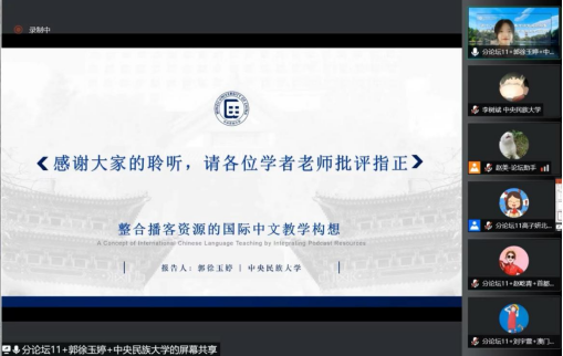 硕士研究生郭徐玉婷以《整合播客资源的国际中文教学构想》为题进行了学术报告。报告对目前现有的代表性中文播客进行了介绍和分析,在此基础上对国际中文教学资源建设提出了一些设想,希望能推动中文教学模式的创新,进一步丰富国际中文教学资源建设。