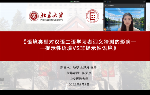 硕士研究生冯冰团队以《语境类型对汉语二语学习者词义猜测的影响——提示性语境VS非提示性语境》为题进行了学术报告,报告对影响汉语二语学习者词义猜测的语境类型进行分析,并提出了语境策略词汇教学方法和教材编写建议,在一定程度上推动了汉语二语词汇教学研究的发展。
