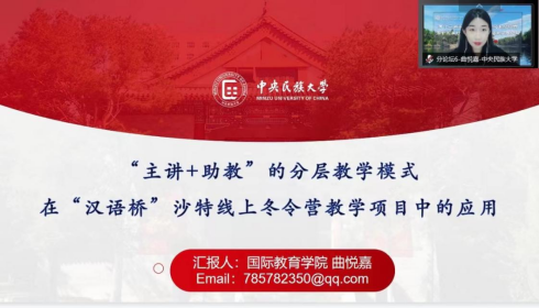 硕士研究生曲悦嘉以《“主讲+助教”的分层教学模式在“汉语桥”沙特线上冬令营教学项目中的应用》为题,详细分析与总结该教学模式的具体实施和特点,同时针对所出现的问题提出三点建议,旨在为后疫情时代对外汉语短期线上集体教学模式的建构提供有益参考与借鉴。