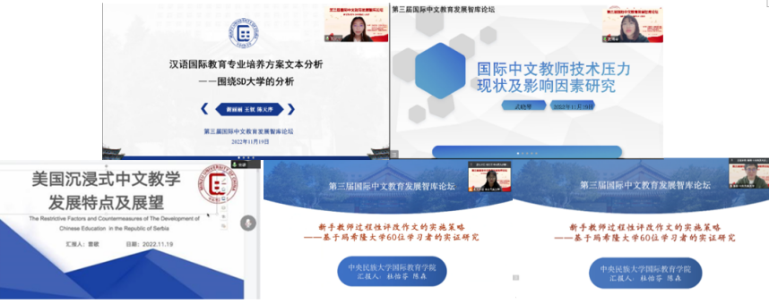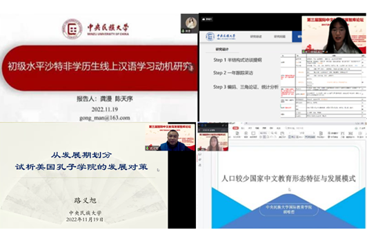 在国际中文教育传播与发展分论坛中,2017级博士生路义旭宣读了论文《从发展期的划分试析美国孔子学院发展对策》;2021级博士生胡唯哲报告了论文《人口较少国家中文教育形态特征与发展》,就人口较少国家中文教育在发展过程中呈现出的内部形态特征和发展模式构建进行了分析研究。