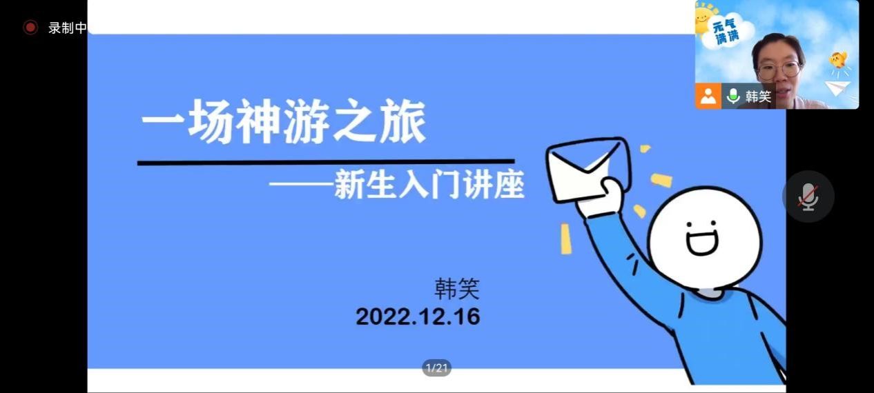 韩笑副教授为2022级中国本科新生进行了线上入门课程讲座。韩笑老师将语言化作星空,将专业化作神游,以“一场神游之旅”为主题,讲述个人求学经历,介绍汉语国际教育专业的魅力。
