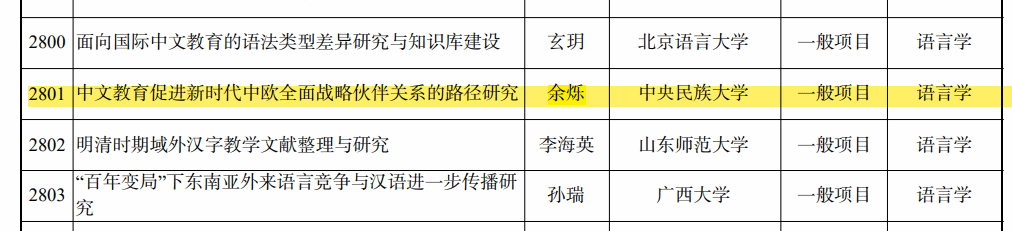 余烁老师的课题“中文教育促进新时代中欧全面战略伙伴关系的路径研究”喜获国家社科基金一般项目立项。