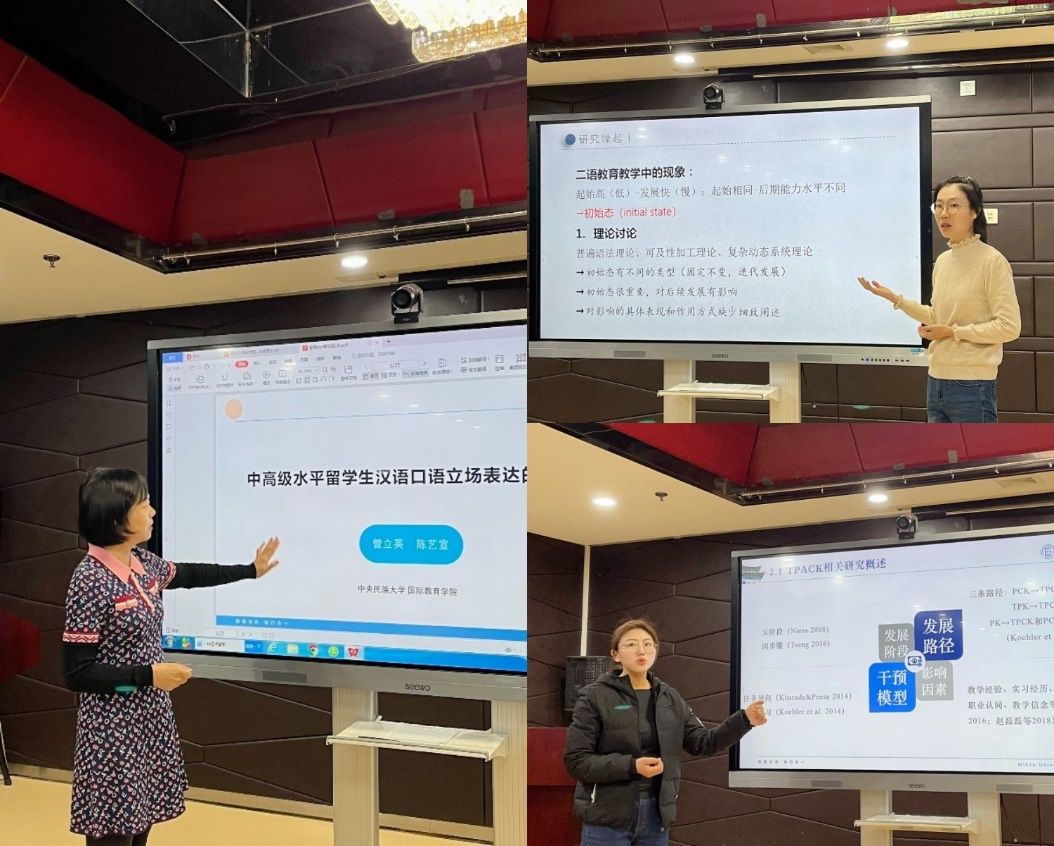首先,曾立英教授、韩笑副教授和博士研究生武晓琴分别对论文主要内容进行了汇报。随后,李先银老师以专业期刊选文与编辑出版为视角,从国际中文教育研究前沿热点、论文实验设计、学术科研规范、论文写作范式、投稿要求及注意事项等多个方面对三篇论文进行了深度点评。最后,李先银老师又与参会的师生们展开了热烈深入的讨论和交流,对师生们提出的问题一一解答。