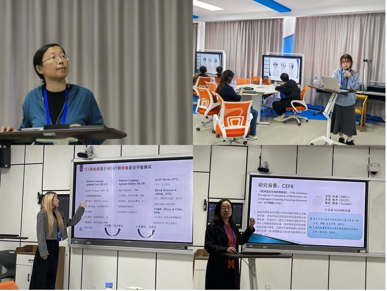 国际中文测试与教材研究分论坛上,罗莲老师报告了与2022级硕士研究生刘婉欣合作的研究《HSK(一级~六级)阅读测试与CEFR连接研究》,2022级本科生朱雨含报告了《语言学能测试研究述评》。国际中文教学与教法研究分论坛上,2024级硕士研究生周世豪报告了《情绪偏好视角下虚拟现实技术在汉语学习中的应用》,2024级硕士研究生唐萍萍报告了《线上一对一国际中文教学中师生情感互动话语分析》。
